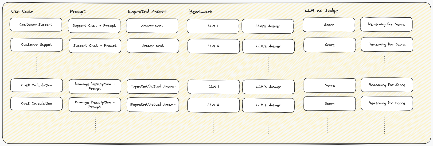 We used the same approach for his other use cases. Prompt, expected answer, and then one answer per model along with the judge model's evaluation.