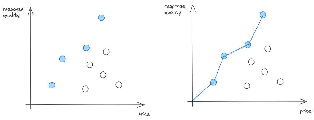 Here's my attempt to visualize this: I've plotted the price of a model on the x-axis and the response quality on the y-axis. The LLMs we benchmarked are the dots. For all models plotted in blue there is no model that's cheaper and better. Connecting these gives you the Pareto frontier: the best models for a given price.